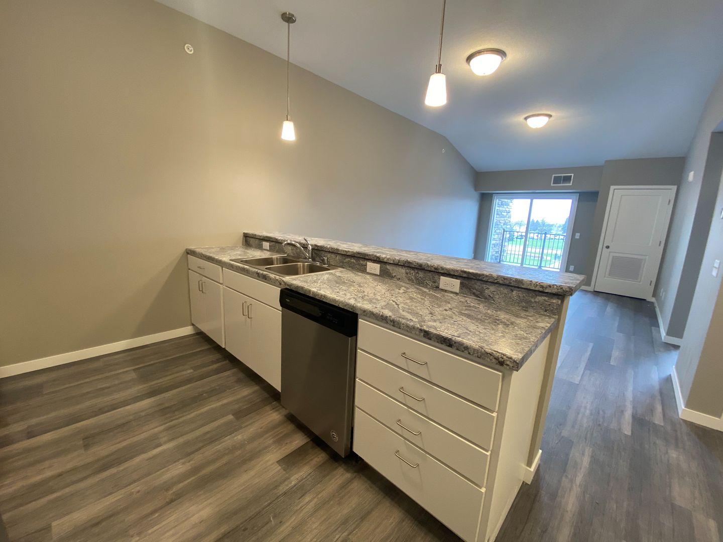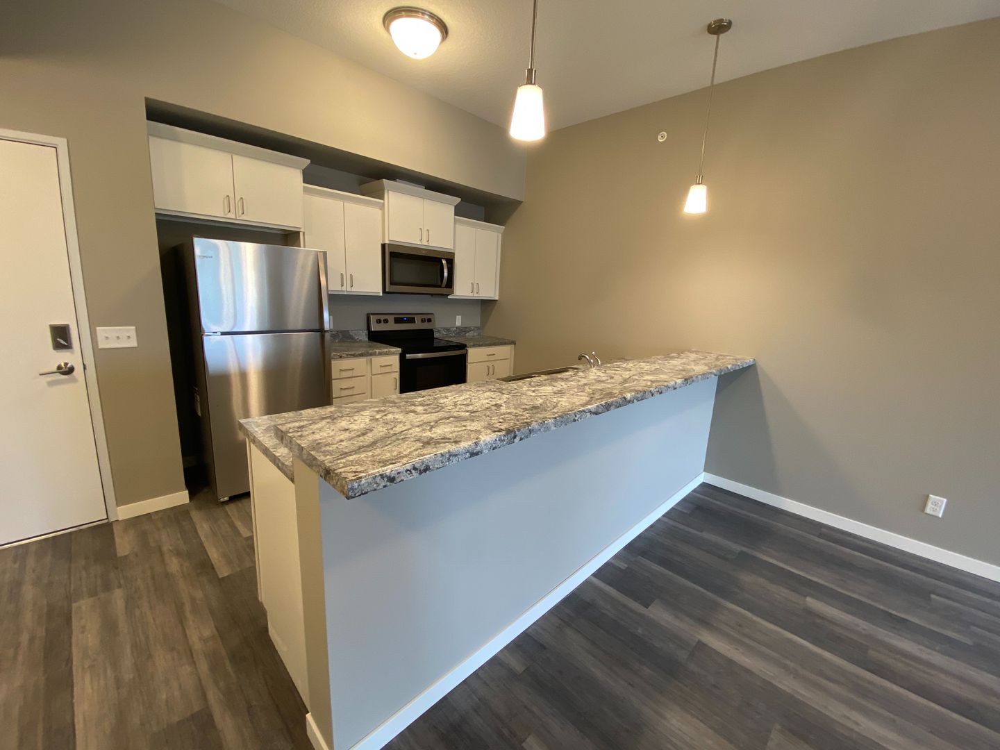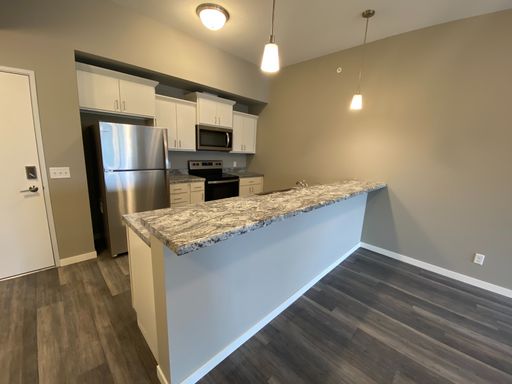 The Pointe @ Merchant Square welcomes you to a modern feel home with the ease of maintenance free apartment living. We offer 6 month, 9 month, 12 month, 15 month and 18 month lease terms to best fit your housing needs. The Pointe @ Merchant Square consists of 1 and 2 bedroom open floorplan units with a spacious kitchen including stainless steel appliances and large living area with hardwood style flooring. Take advantage of the fitness center to help unwind after a long day at work. Have a family gathering coming up? We have just the spot in our furnished Social Space with a large flat screen TV and fireplace. Garage stalls and storage units are available, as well as off street parking in the well-lit parking lot. The building is equipped with controlled access and security camera system. We are conveniently located off Interstate 35, near restaurants, shopping, hotels and multiple employers. Enjoy sitting outside on your very own balcony or grill your favorite meal on the relaxing community patio. Let your dog meet other four-legged friends at our designated pet run.